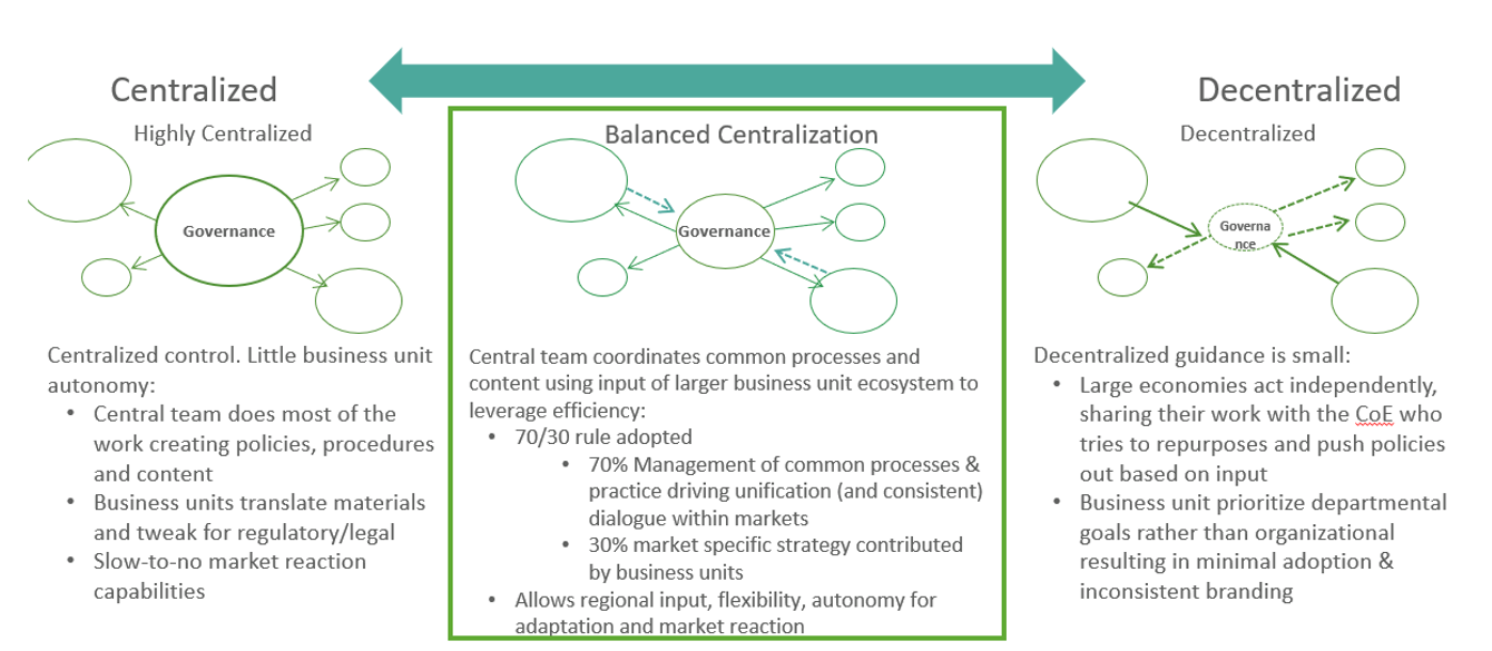When considering the right governance model to support the activation & ongoing success of your Aprimo solution, a balanced centralization approach is often the right model to form the foundation for success. This model allows for a central team to garner input of the larger regional ecosystem to leverage efficiency, while allowing autonomy for adaptation and local market needs.