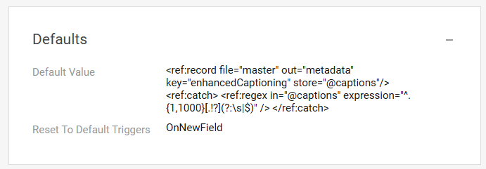 To make the captions visible in the field, configure the following reference code to the default value (this will extract up to 1000 characters of captions into a field, ending with a full sentence):