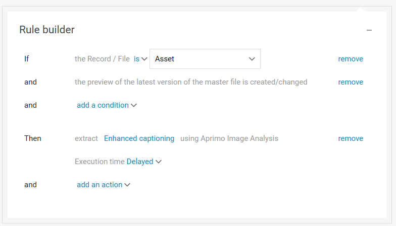 Note: If your asset versions require re-rendering of the enhanced captions for each version, you can modify the rule by omitting the condition that checks if the caption field is empty and replace the preview exists condition with "Master File preview created or changed". Additionally, you should add "On Master File Change" as an extra trigger to the "Reset to Default" condition on the caption field. These adjustments ensure that enhanced captions are generated for each version and remain visible in the DAM UI.