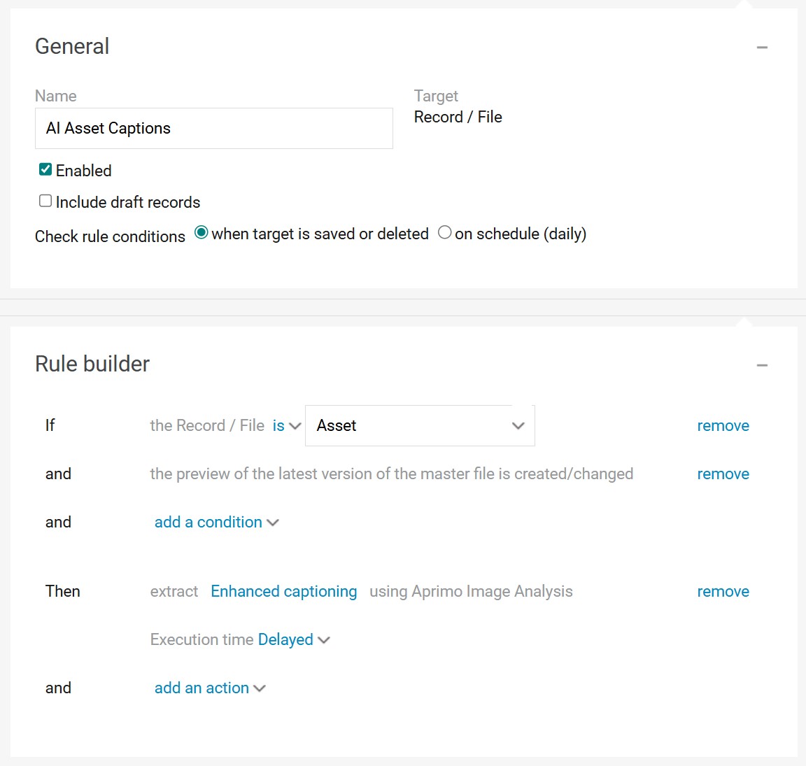 The image below shows a rule to generate enhanced captions for all ingested image content. It's important to carefully consider additional conditions, such as which image categories you want this rule to apply to, or the status the assets should have before enhanced captions are added. You can then adjust the rule conditions accordingly.